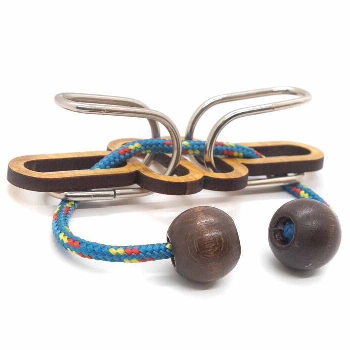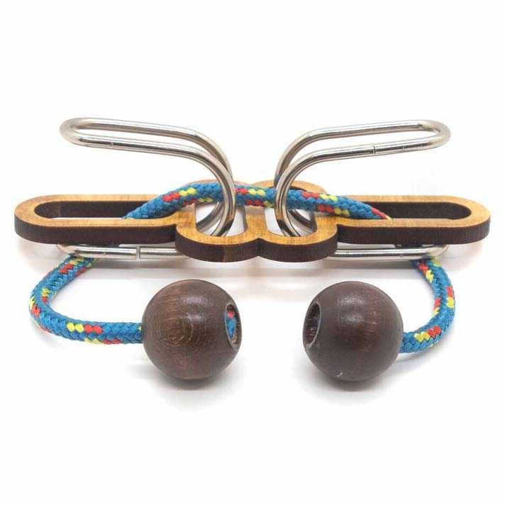 Blaue Schnur ist ein Seilpuzzle von Jean Claude Constantin. Aufgabe ist es, die beiden Metallteile aus dem Puzzle zu befreien und anschließend wieder an die Ausgangsposition zu bekommen.