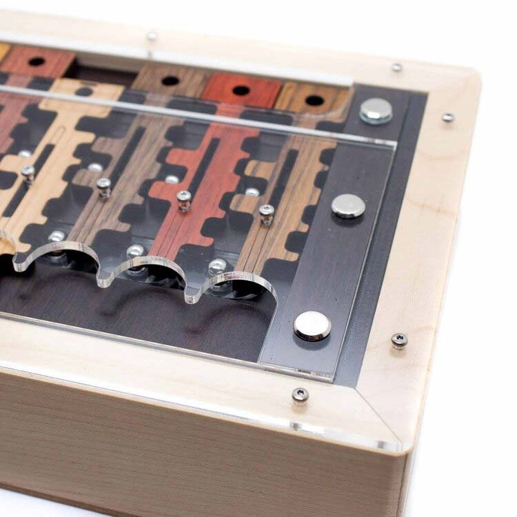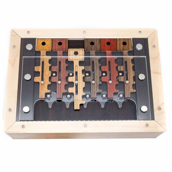 Der Deckel dieser Trickkiste von Jean Claude Constantin besteht aus 6 Schlüsseln, die in die richtige Position gebracht werden müssen. Erst wenn alle sechs Schlüssel richtig positioniert sind, kann die Box geöffnet werden. Durch die Plexiglasscheibe haben Sie freien Blick in die Box und auf die Mechaniken.