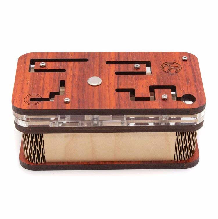 Die Irrsinns Box Ist eine Trickkiste von Jean Claude Constantin. Auf der Oberseite befindet sich ein Labyrinth, dass Sie lösen müssen, um die Box zu öffnen. Dazu gibt es Ebenen, die sich um Metallstifte bewegen.