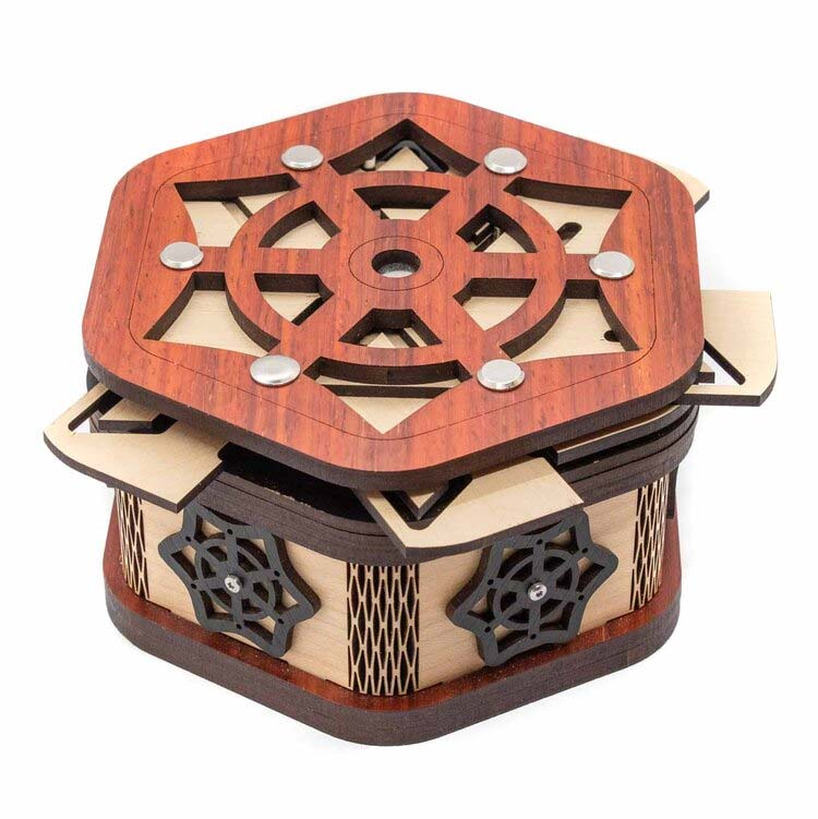 Die Sternary Box ist eine schöne Trickkiste von Jean Claude Constantin. Die Box hat als Deckel ein Sternary, eine Art Labyrinth mit mehreren verschiebbaren Elementen. Aufgabe ist es, die Box zu öffnen.