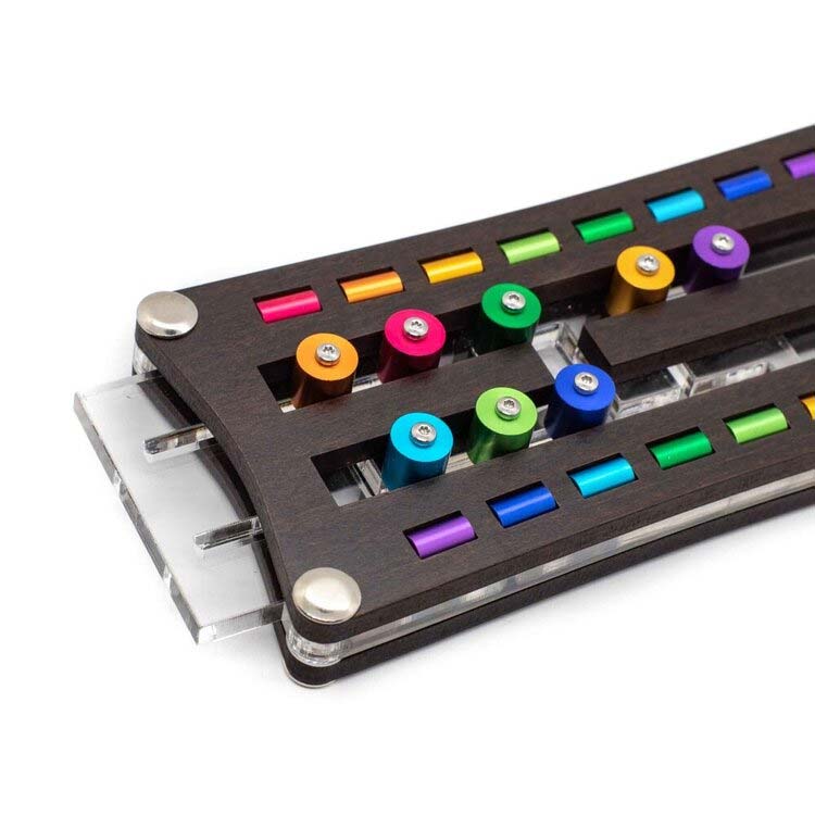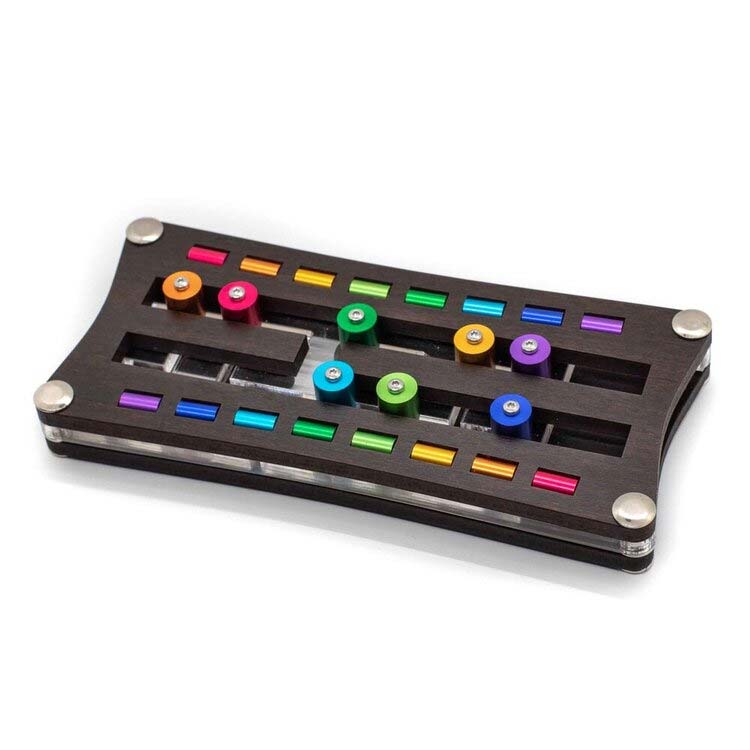 Nur 8 Elox besteht aus einer Grundplatte und acht farbigen Metallelementen, die sich alle auf einer Seite der Platte befinden. Aufgabe ist es, die Elemente durch Verschieben durch den Auslass in der Mitte auf die andere Seite der Platte zu bekommen. Und zwar so, dass sie zu den in die Grundplatte eingelassenen Farben passen.