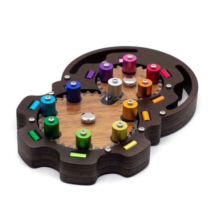 5 et 7 ist ein Drehpuzzle mit zwei Zahnrädern. Im großen Zahnrad sind 7 Aussparungen mit farbigen Elementen, im kleinen 5. Zwischen den Zahnrädern kann man die farbigen Elemente nur in der Mitte wechseln. Aufgabe ist es, die farbigen Elemente durch Drehen und wechseln der Zahnräder zu ihren farblich entsprechenden Positionen zu bringen.