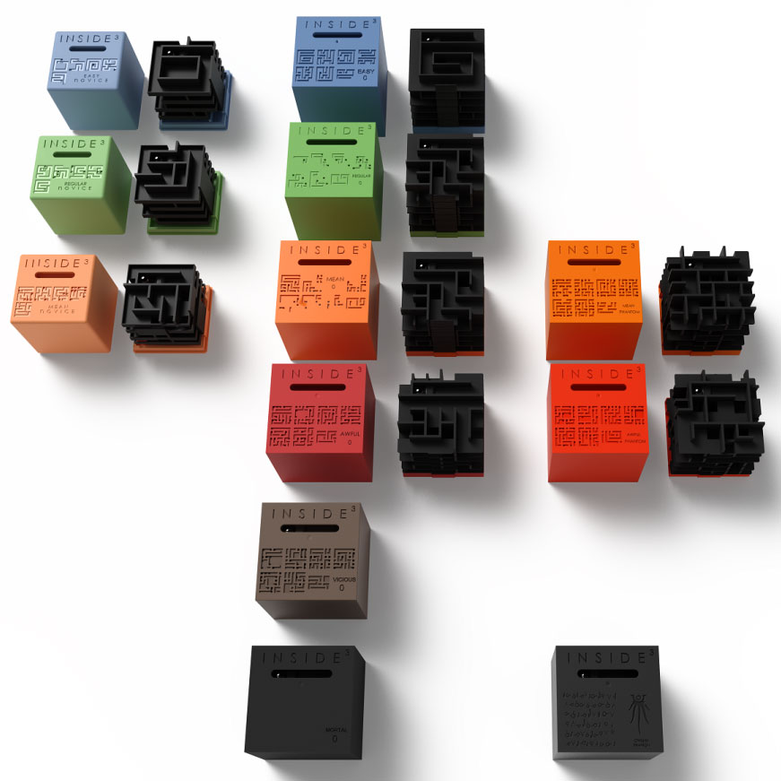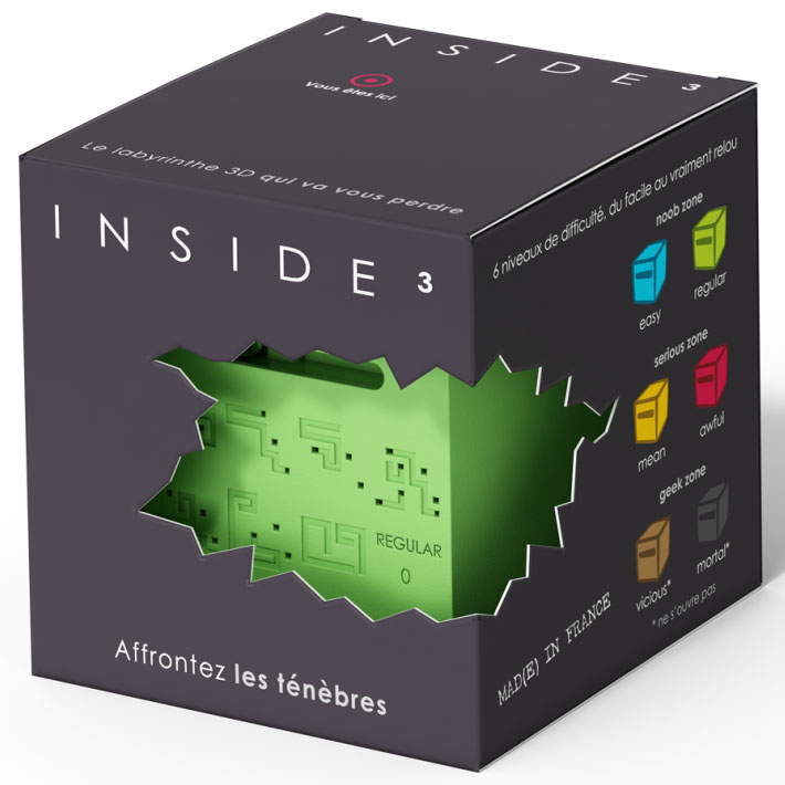 INSIDE³ ist im Prinzip ganz einfach erklärt: Ein 3D-Labyrinth im Dunkeln. Aufgabe ist es, die Kugel aus dem Labyrinth zu befreien und anschließend wieder zurück zum Ausgangspunkt zu bringen. Als Hilfe ist auf dem Würfel eine Labyrinth-Karte aufgezeichnet. Je nach Cube und Level besteht bei einigen die Möglichkeit, den Cube zu öffnen und das Labyrinth anzusehen. Oder sie haben noch eine weitere Kugel, um es schwerer zu machen. Aufgeteilt sind die Cubes in drei Serien und fünf Schwierigkeitslevel.