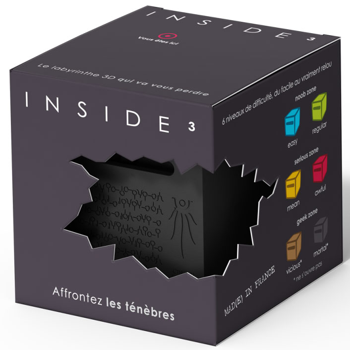 INSIDE³ ist im Prinzip ganz einfach erklärt: Ein 3D-Labyrinth im Dunkeln. Aufgabe ist es, die Kugel aus dem Labyrinth zu befreien und anschließend wieder zurück zum Ausgangspunkt zu bringen. Als Hilfe ist auf dem Würfel eine Labyrinth-Karte aufgezeichnet. Je nach Cube und Level besteht bei einigen die Möglichkeit, den Cube zu öffnen und das Labyrinth anzusehen. Oder sie haben noch eine weitere Kugel, um es schwerer zu machen. Aufgeteilt sind die Cubes in drei Serien und fünf Schwierigkeitslevel.