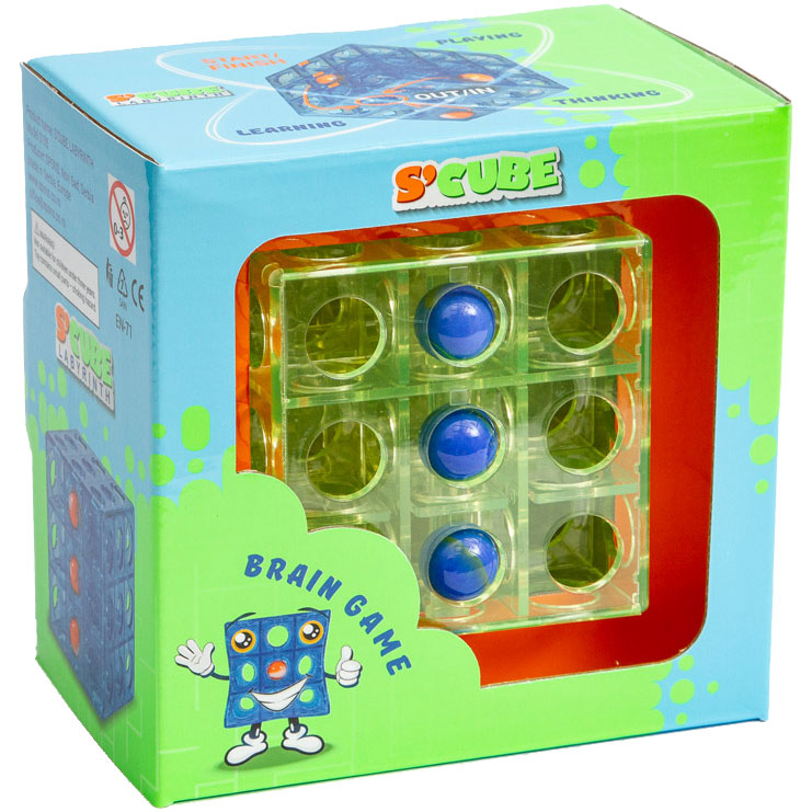 Der grüne S'Cube Labyrinthwürfel für Fortgeschrittene. Aufgabe ist es, die Kugeln durch die unterschiedliche großen Löcher zu führen und so das Labyrinth zu besiegen. Der Kurs für alle 3 Kugeln durch das Labyrinth ist nicht einfach zu finden. Die Lösung erfordert hohe Aufmerksamkeit und gutes räumliches Denken.
