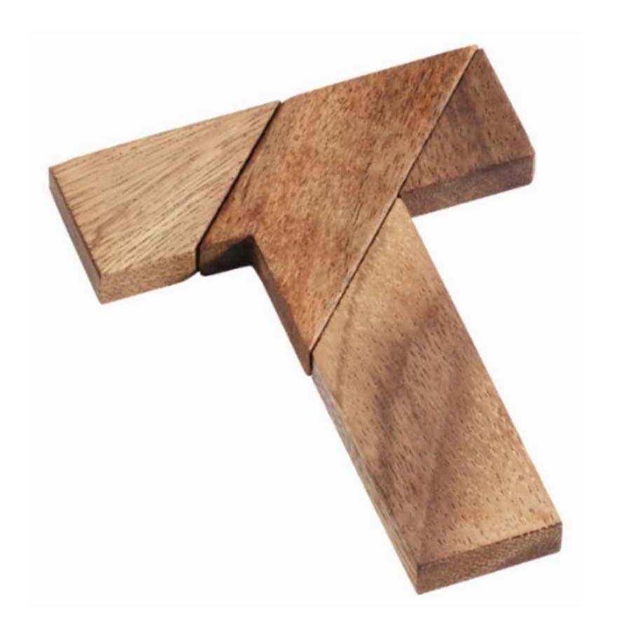 Das T Puzzle besteht aus 4 Puzzleteilen, aus denen ein T gebildet werden muss. Gar nicht so einfach. Aber es gibt noch viele weitere Formen, die man bilden kann.