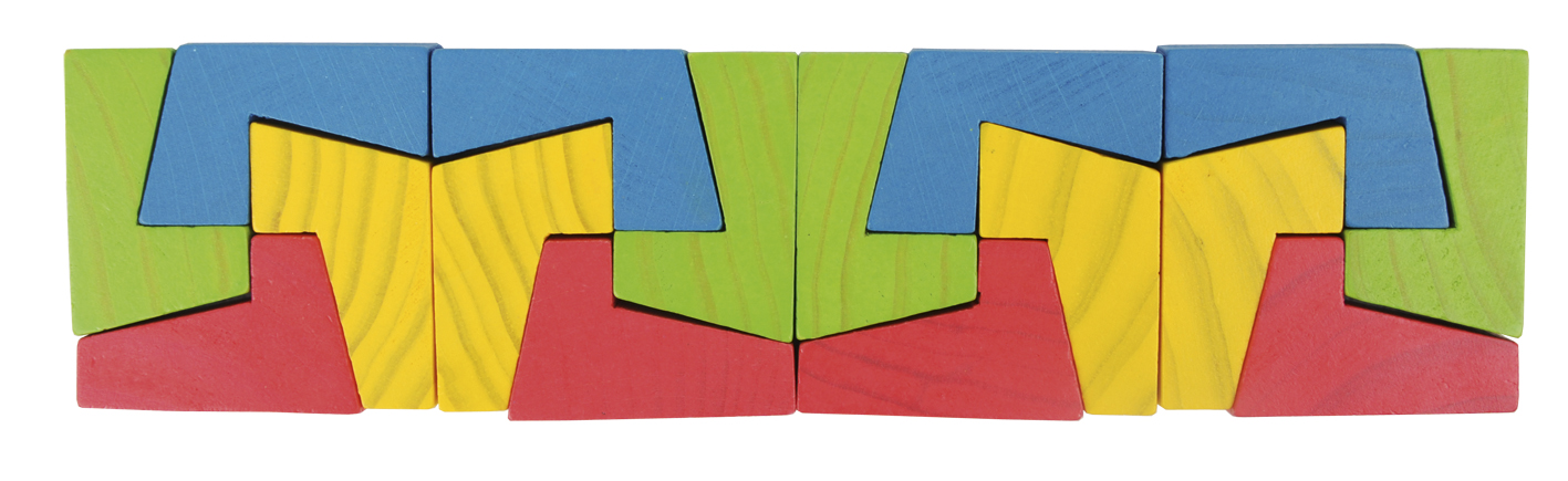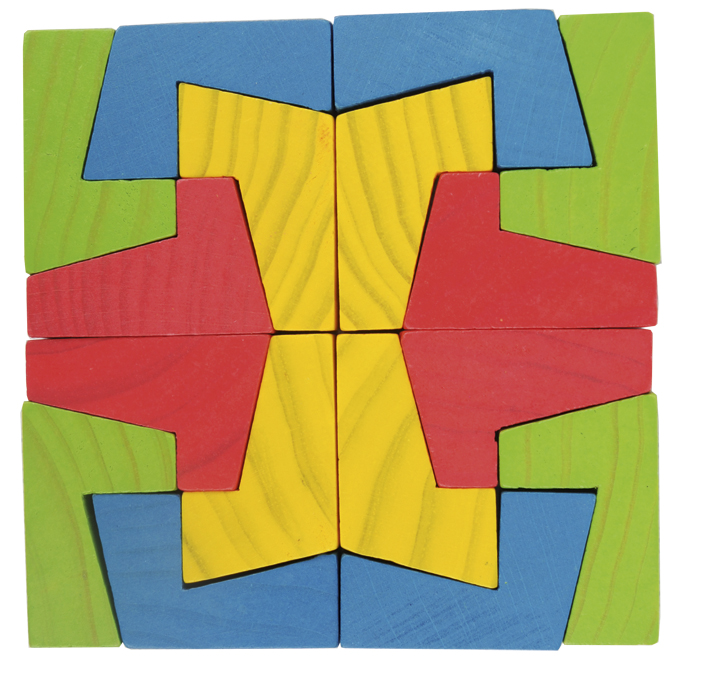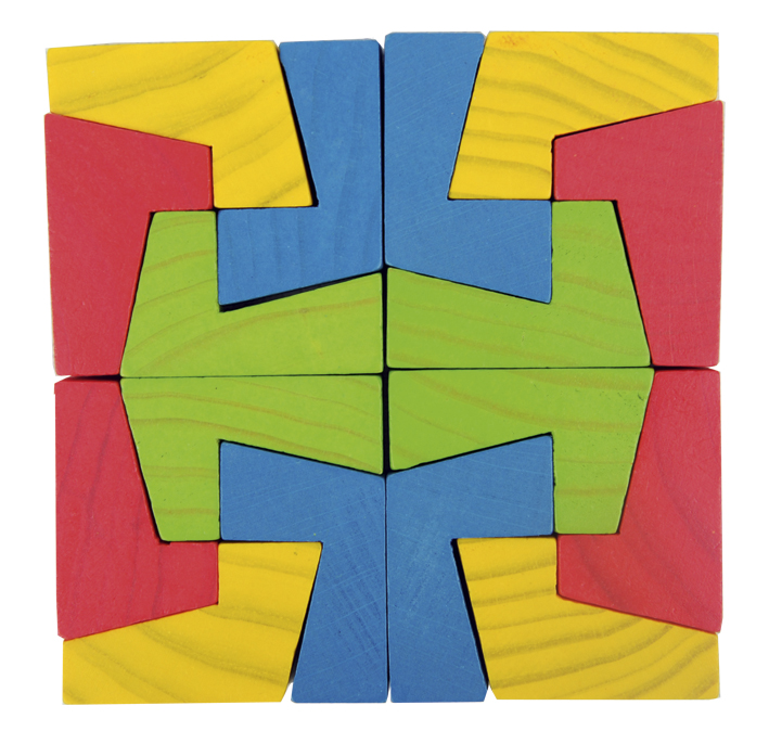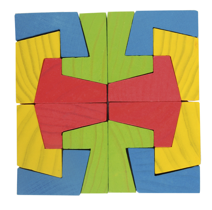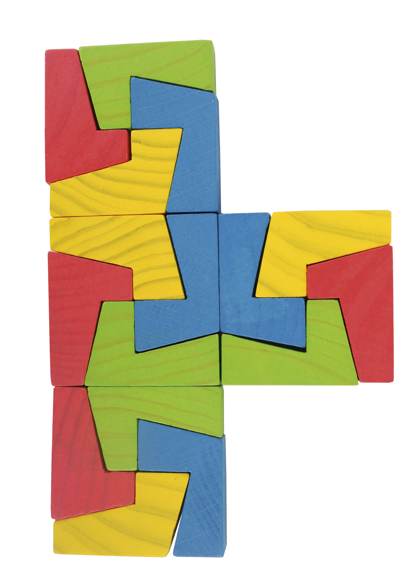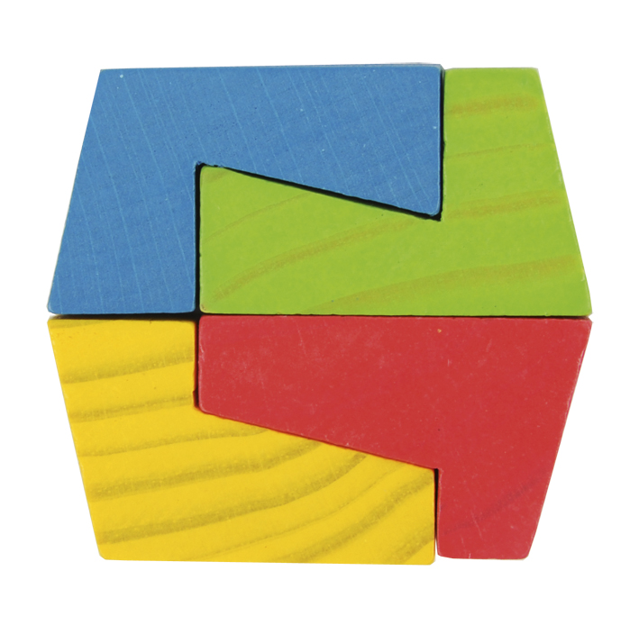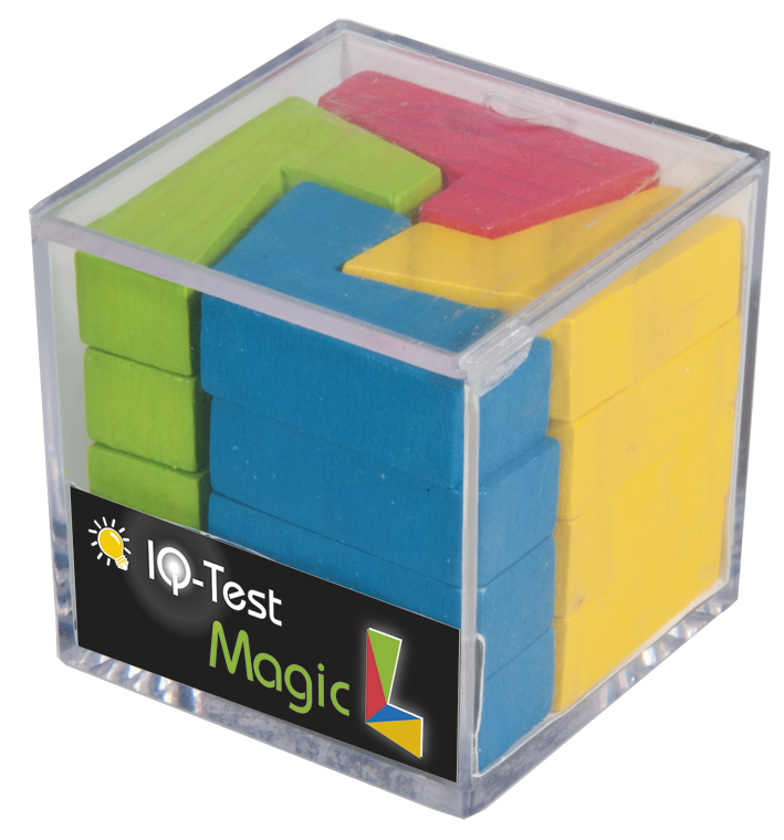 Der IQ-Test "Magic L" ist ein Geduldsspiel aus Holz. Die farbigen Holzteile werden in einer Plexiglasbox geliefert.