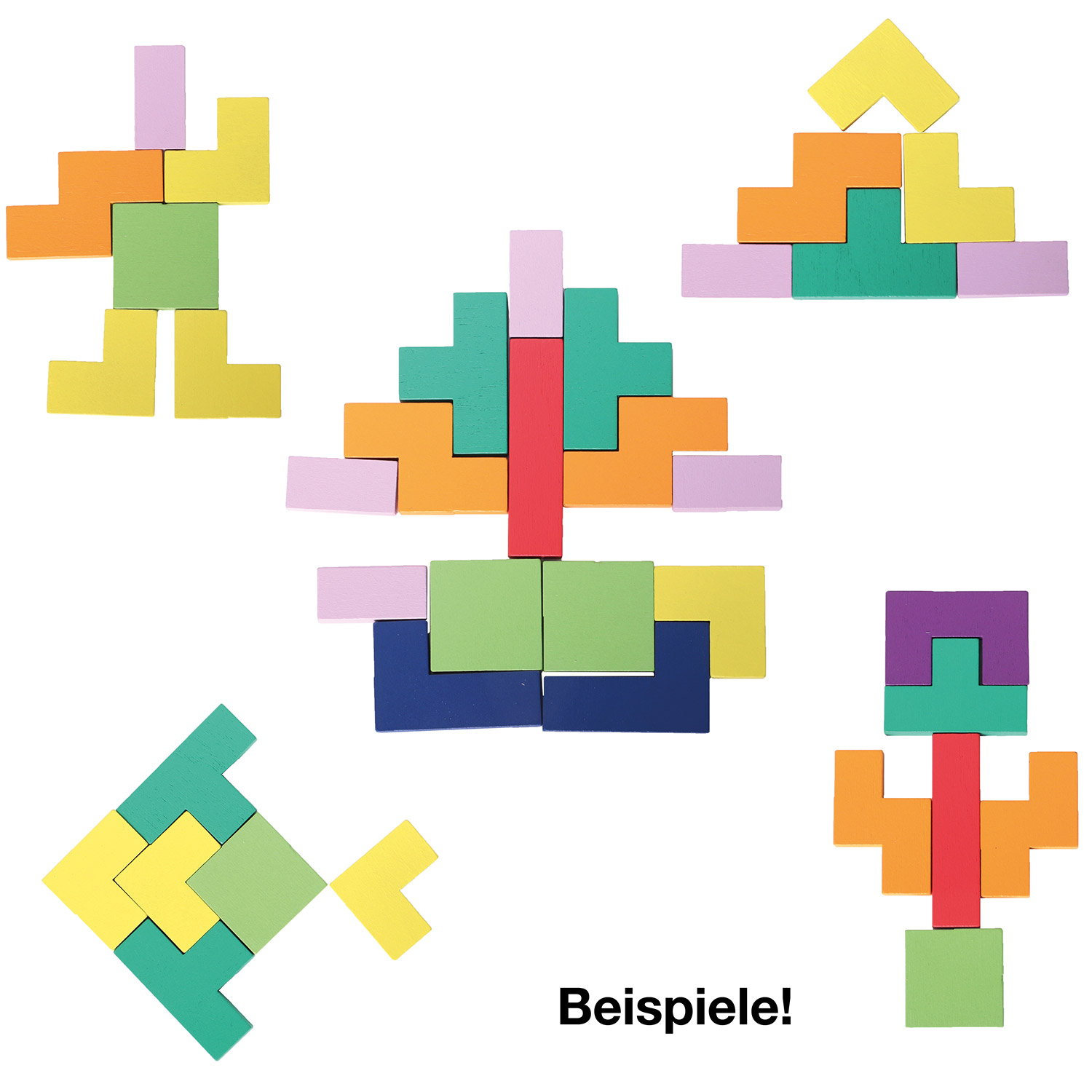 Legen Sie verschiedene Formen mit den farbenfrohen Teilen oder forderns Sie sich heraus ob sie alle Teile wieder in den Rahmen puzzeln können!
