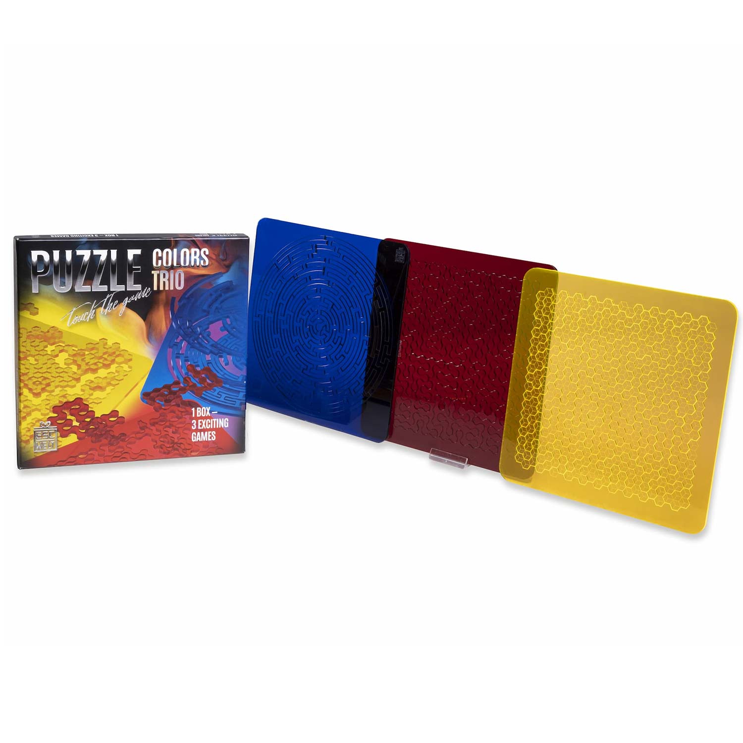 Puzzle Color Trio ist ein Set aus drei Legepuzzlen, die aus farbigem Plexiglas hergestellt wurden. Aus folgenden Puuzle besteht das Set: