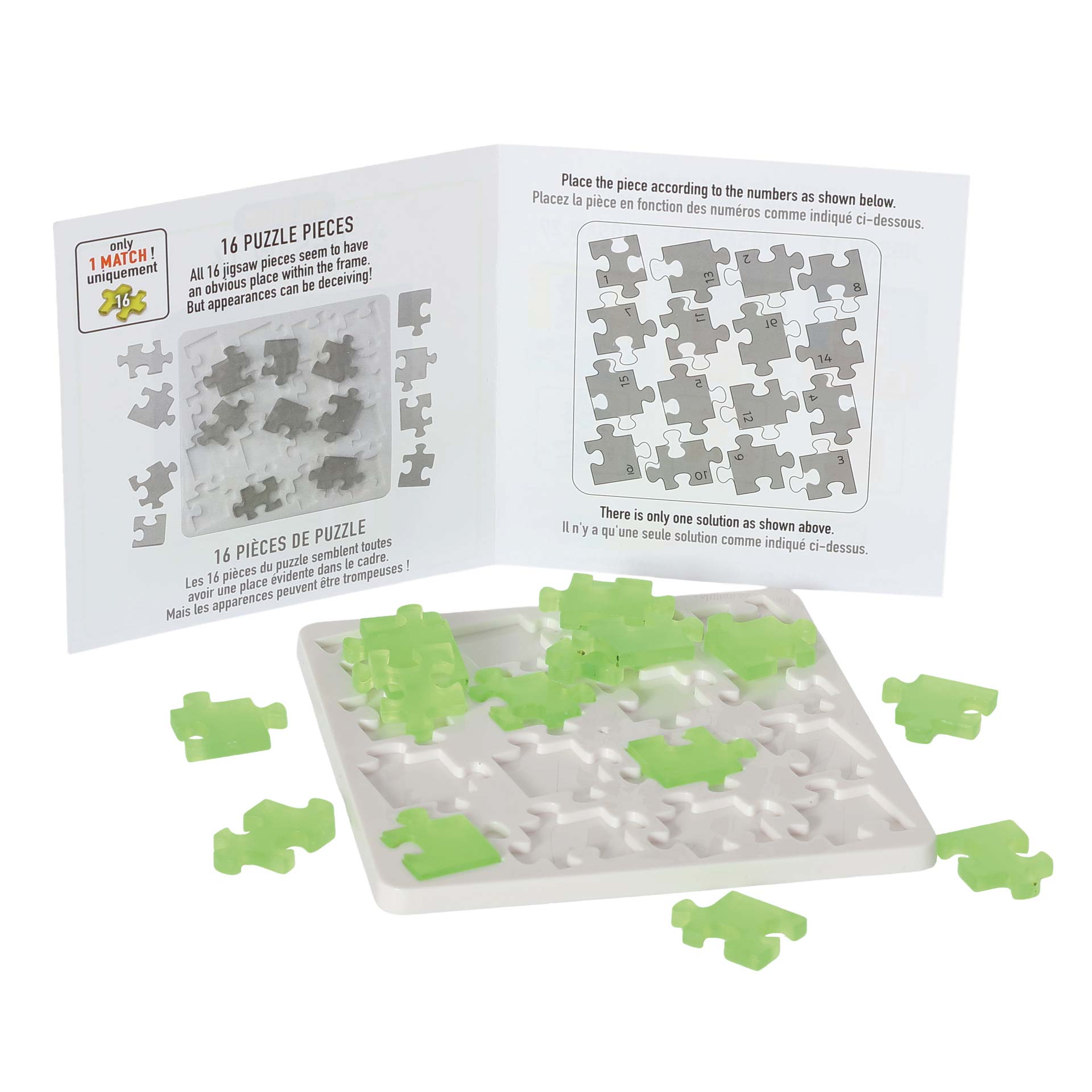 Puzzle mit außergewöhnlichen Puzzleteilen. Wer schafft es, dass alle 16 Teile Platz im Rahmen finden? Mit Lösung.