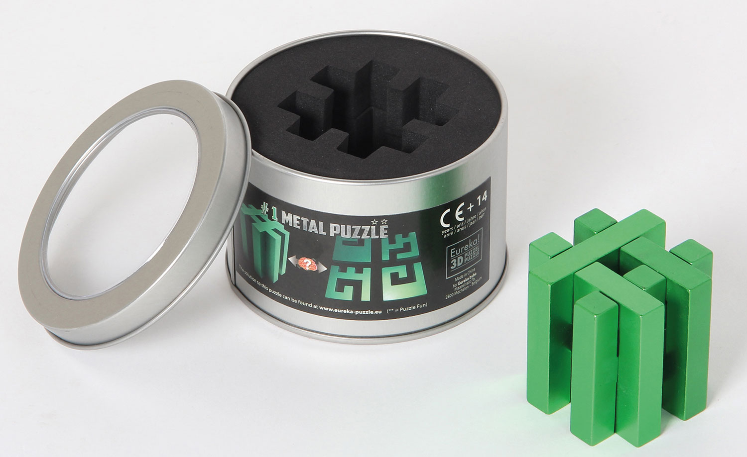 Das Metallpuzzle "Hashtag" von Eureka. Schaffen Sie es, die Puzzleteile zu trennen und anschließend wieder zusammen zu setzen? Wird in einer silbernen Dose geliefert.