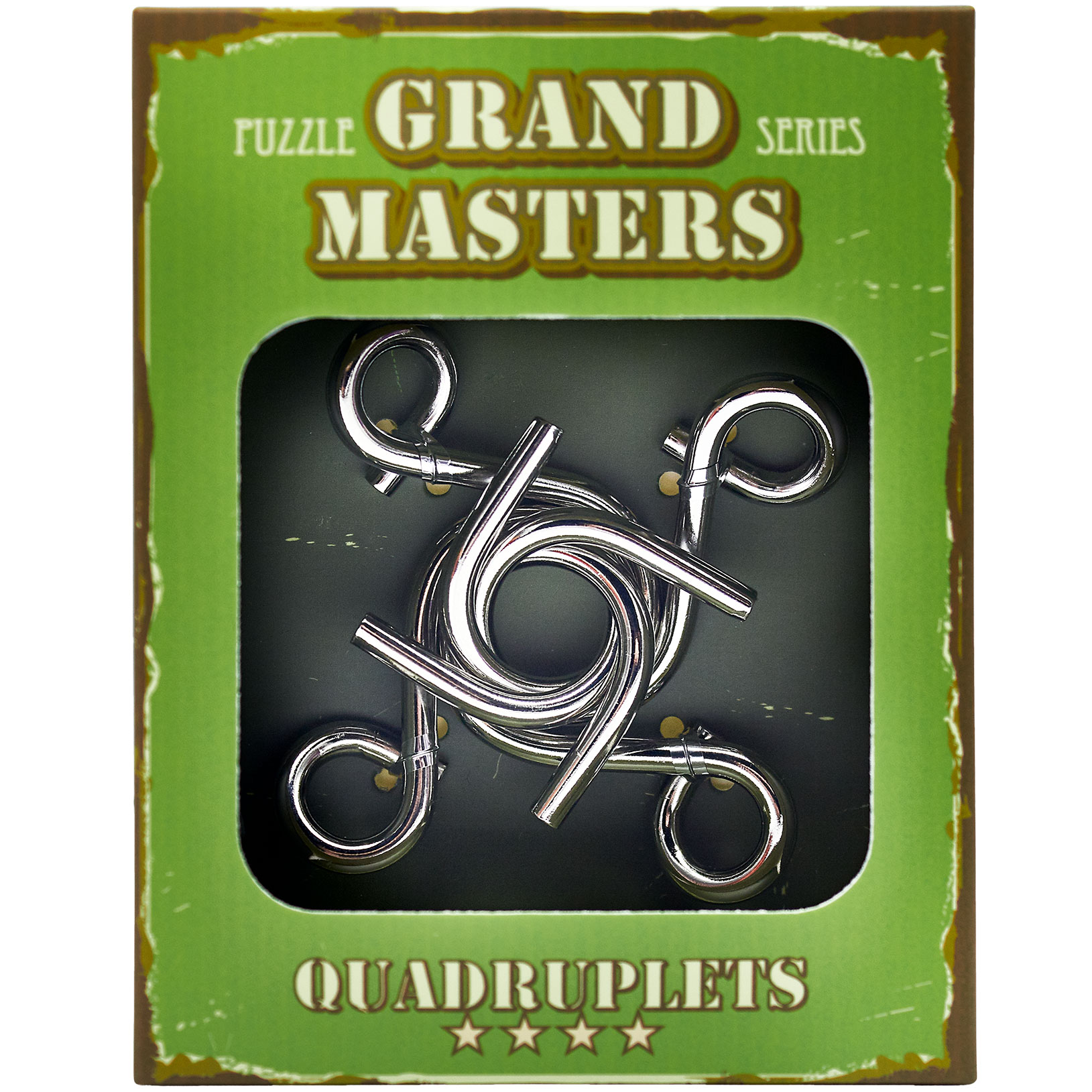 Das Grand Master Quadruplets Puzzle von Eureka. Die Grand Master Puzzle sind extra schwierige Metallpuzzles in Geschenkkarton. Insgesamt gibt es in der Reihe sechs verschiedene Puzzle. Aufgabe ist es, die Teile zu trennen und wieder zusammen zu setzen.