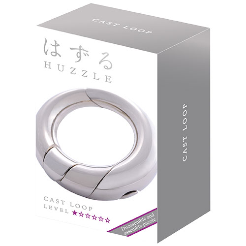 Huzzle Cast Puzzle Loop in neuer Huzzle-Verpackung. Aufgabe des verzwickten Metallpuzzles ist es, die Teile voneinander zu lösen und wieder zusammenzufügen.