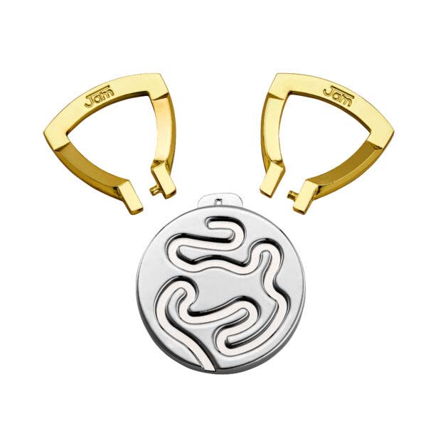 Das Huzzle Cast Jam hat zwei Ringe, die auf einer flachen, runden Scheibe frei gleiten. Jeder Versuch, sie zu trennen, blockiert den anderen. Erkunde die verschlungenen Wege auf beiden Seiten und finde den Durchbruch, der sie freigibt. Entworfen vom japanischen Puzzlekünstler Yuu Asaka.
