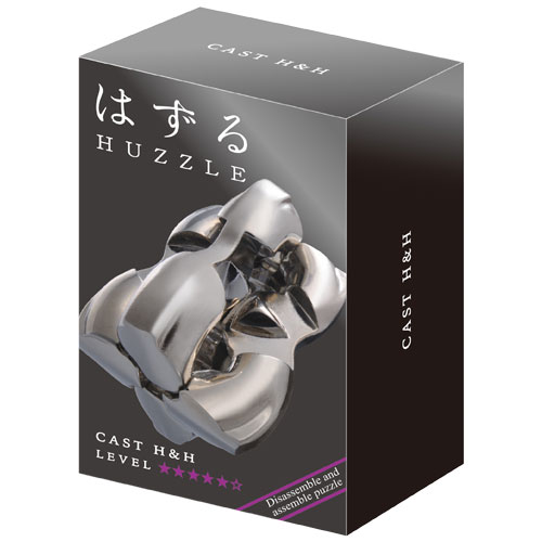 Huzzle Cast Puzzle H & H in neuer Huzzle-Verpackung. Aufgabe des verzwickten Metallpuzzles ist es, die Teile voneinander zu lösen und wieder zusammenzufügen.