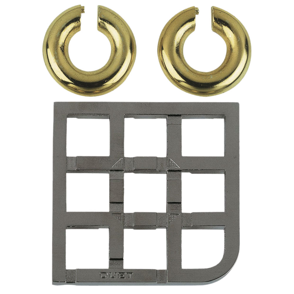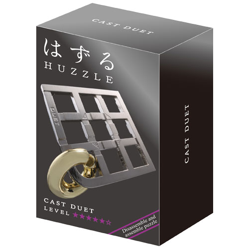 Huzzle Cast Puzzle Duet in neuer Huzzle-Verpackung. Aufgabe des verzwickten Metallpuzzles ist es, die Teile voneinander zu lösen und wieder zusammenzufügen.