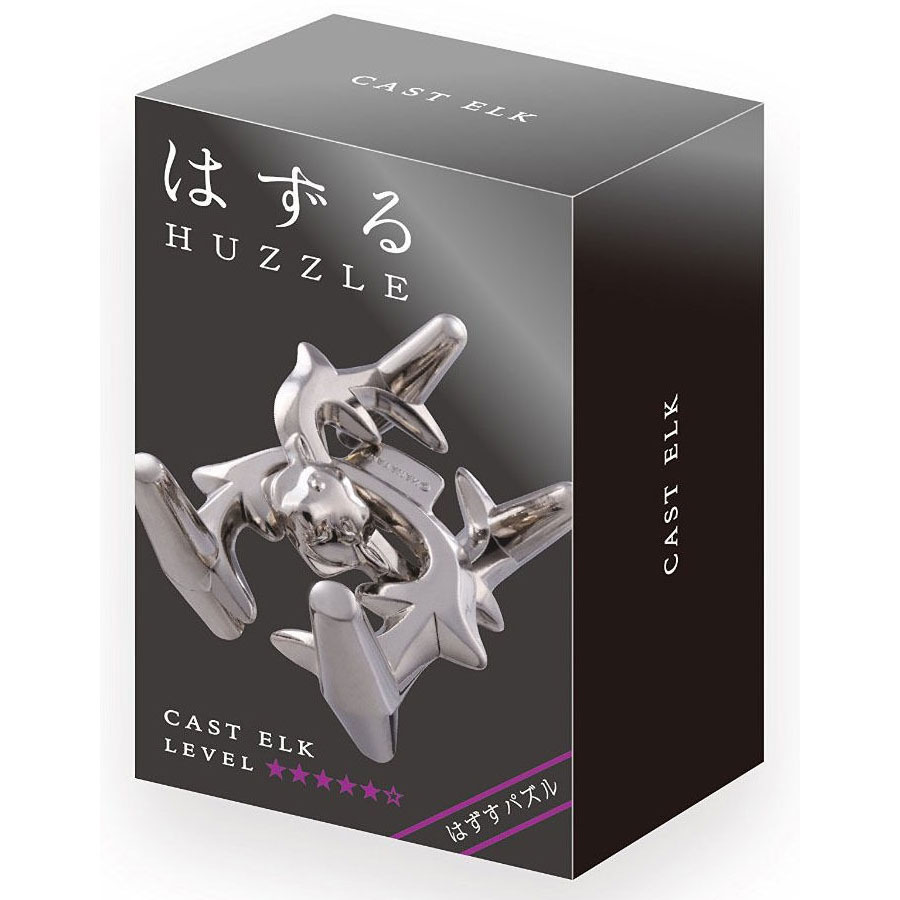 Huzzle Cast Puzzle Elk in neuer Huzzle-Verpackung. Aufgabe des verzwickten Metallpuzzles ist es, die Teile voneinander zu lösen und wieder zusammenzufügen.
