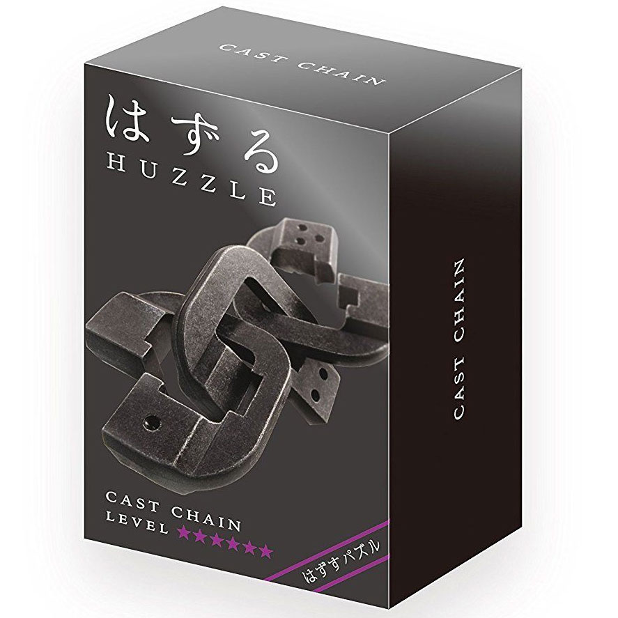 Huzzle Cast Puzzle Chain in neuer Huzzle-Verpackung. Aufgabe des verzwickten Metallpuzzles ist es, die Teile voneinander zu lösen und wieder zusammenzufügen.