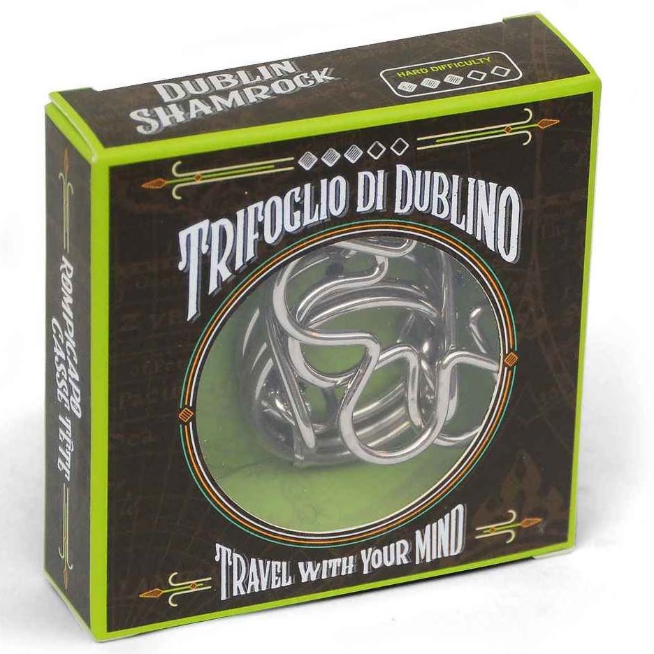 Das Dublin Kleeblatt ist ein Metallpuzzle aus der Serie Travel with your Mind. Aufgabe ist es, den Ring von der kleinen Kette zu trennen und anschließend wieder zusammenzusetzen.