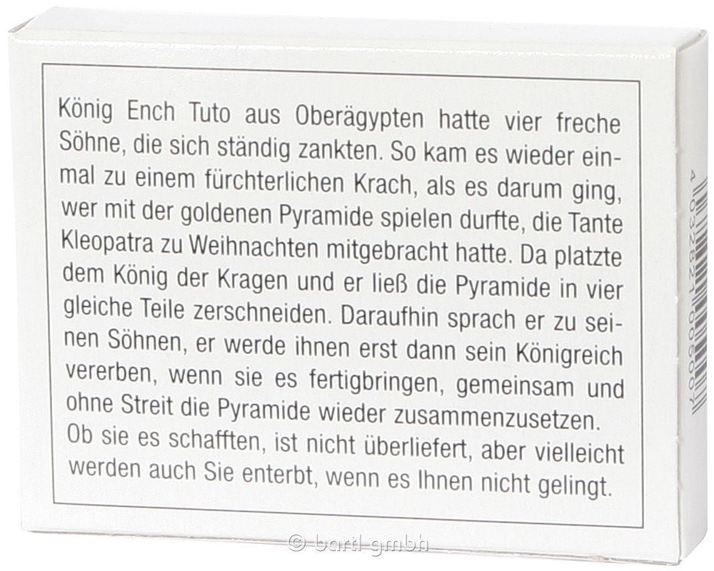 Da sich seine vier Söhne ständig um die Spielpyramide von Tante Cleopatra zankten, zersägte König Ench Tuto sie. Bauen Sie die vierteilige Pyramide wieder auf und der König vererbt Ihnen sein Reich!