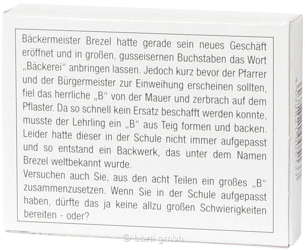 Bäckermeister Brezels Lehrling sollte ein B backen. Da er aber in der Schule nicht aufpasste, wurde daraus die heute so beliebte Breze. Können Sie aus acht Teilen ein B puzzeln?