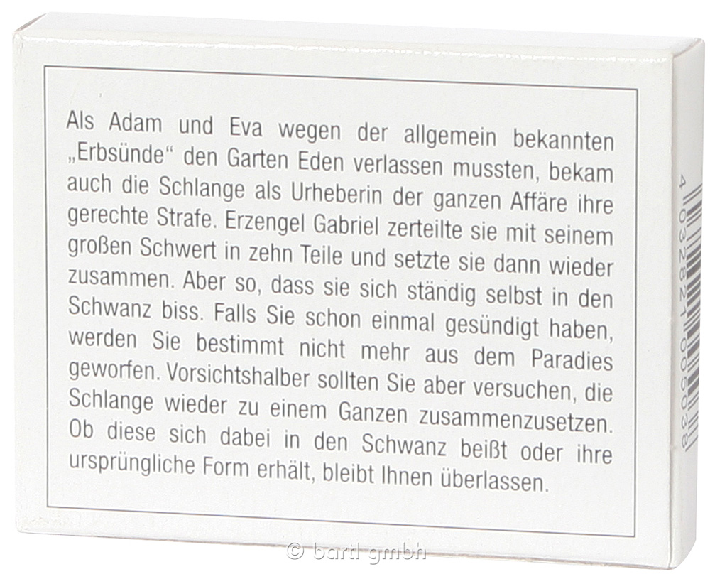 Dass der Erzengel Gabriel die Schlange wegen des Sündenfalls zerlegte, ist ein Gerücht. Aber, dass Sie das Tier aus zehn Teilen wieder zusammenbauen müssen, ist Tatsache!