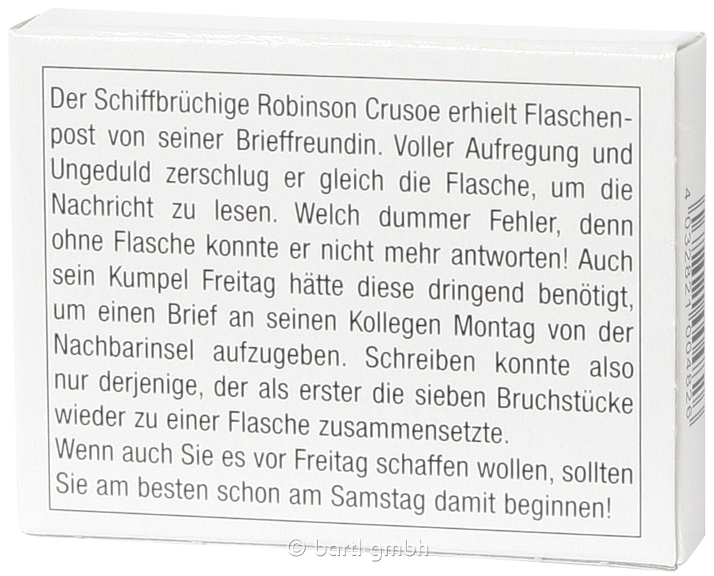 Zwei Schiffbrüchige wollen ihre Post verschicken. Sie haben aber nur eine kaputte Flasche. Wer es schafft, diese aus sieben Teilen zusammenzusetzen, darf seinen Brief versenden.