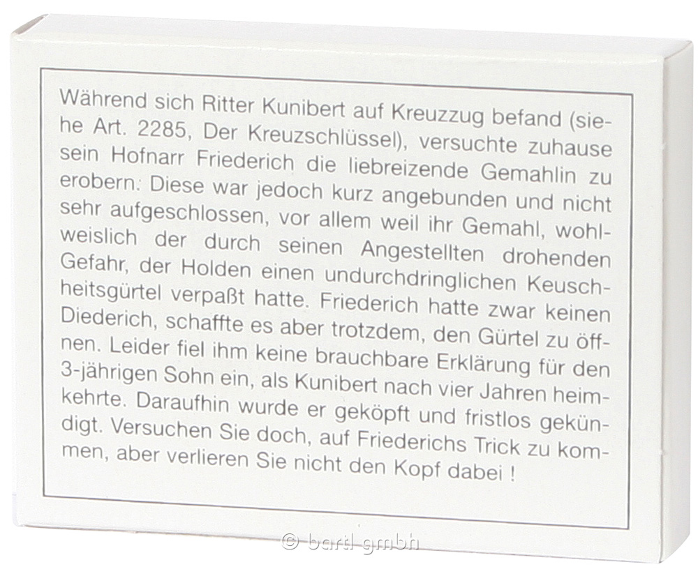 Ritter Kunibert verließ seine Gemahlin nie, ohne sie mit einem Keuschheitsgürtel zu bekleiden. Was die Königin in der vierjährigen Trennung tat, weiß nur der Hofnarr und ihr dreijähriger Sohn.