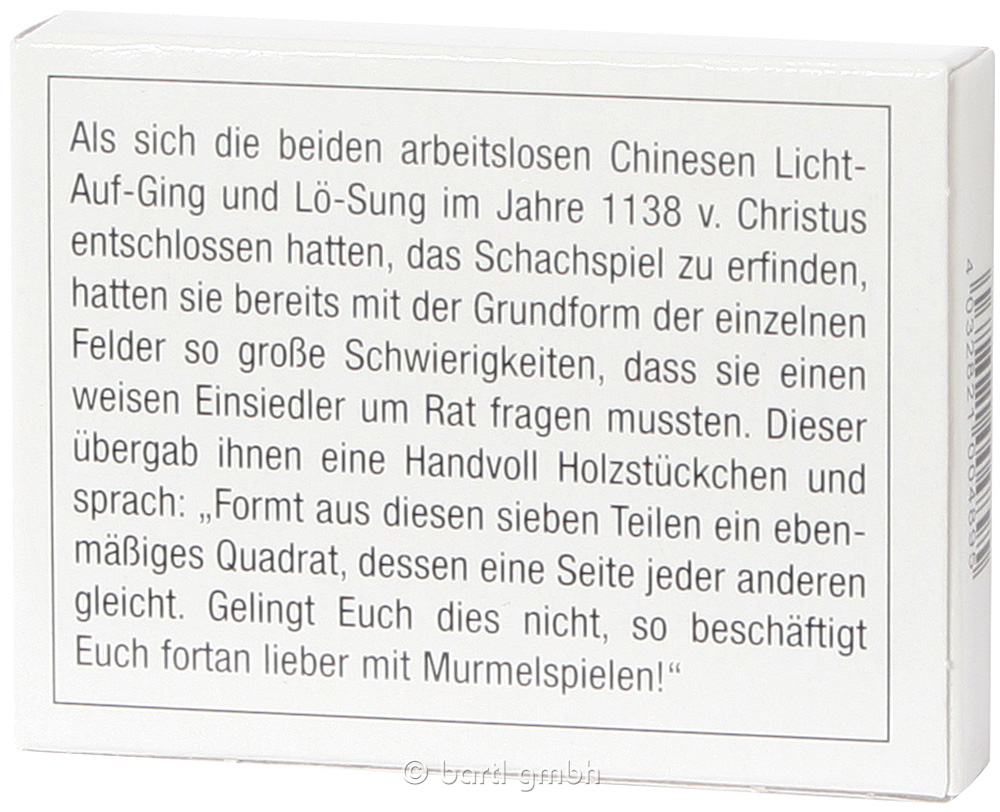 Die Chinesen Licht-Auf-Ging und L-Sung wollten das Schachspiel erfinden. Das misslang. So erfanden sie ein siebenteiliges Quadrat zum Zusammenbauen.