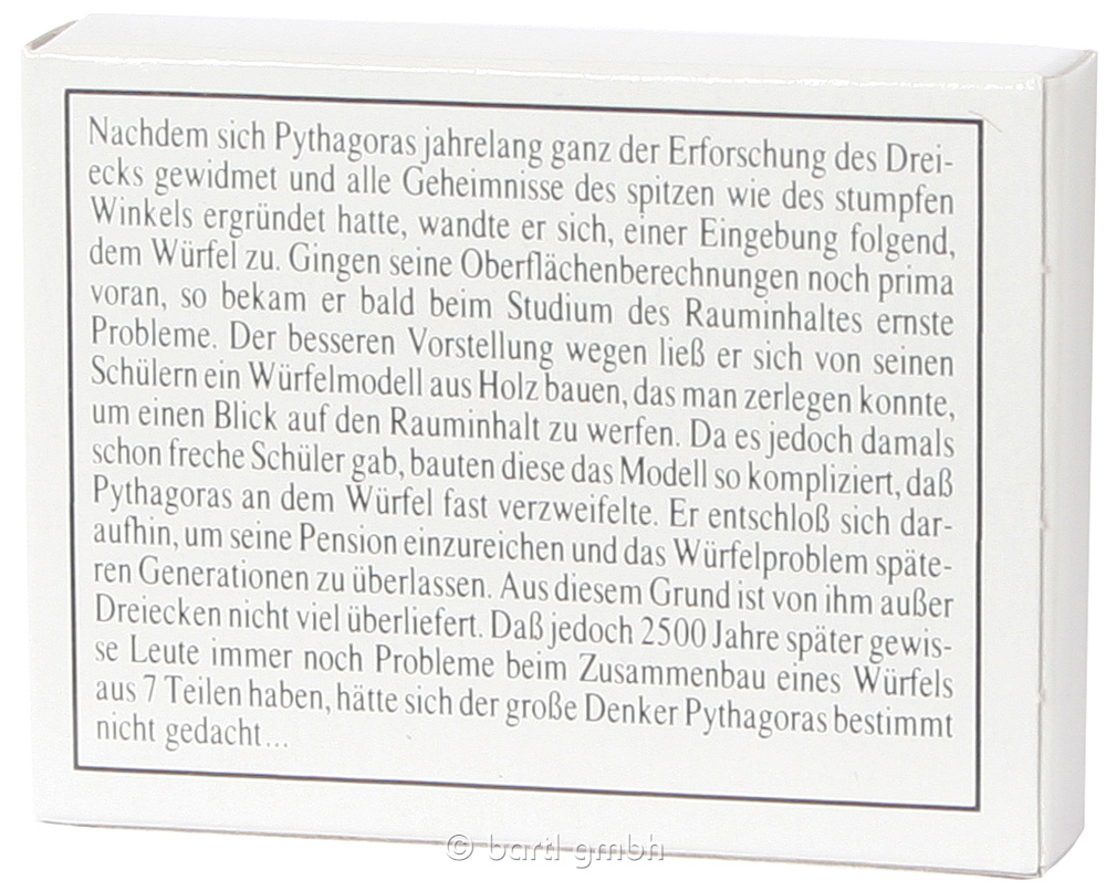 Pythagoras widmete sich dem Würfel, bekam das verflixte Ding aus sieben Teilen aber nicht zusammen, um es zu berechnen. Helfen Sie ihm!