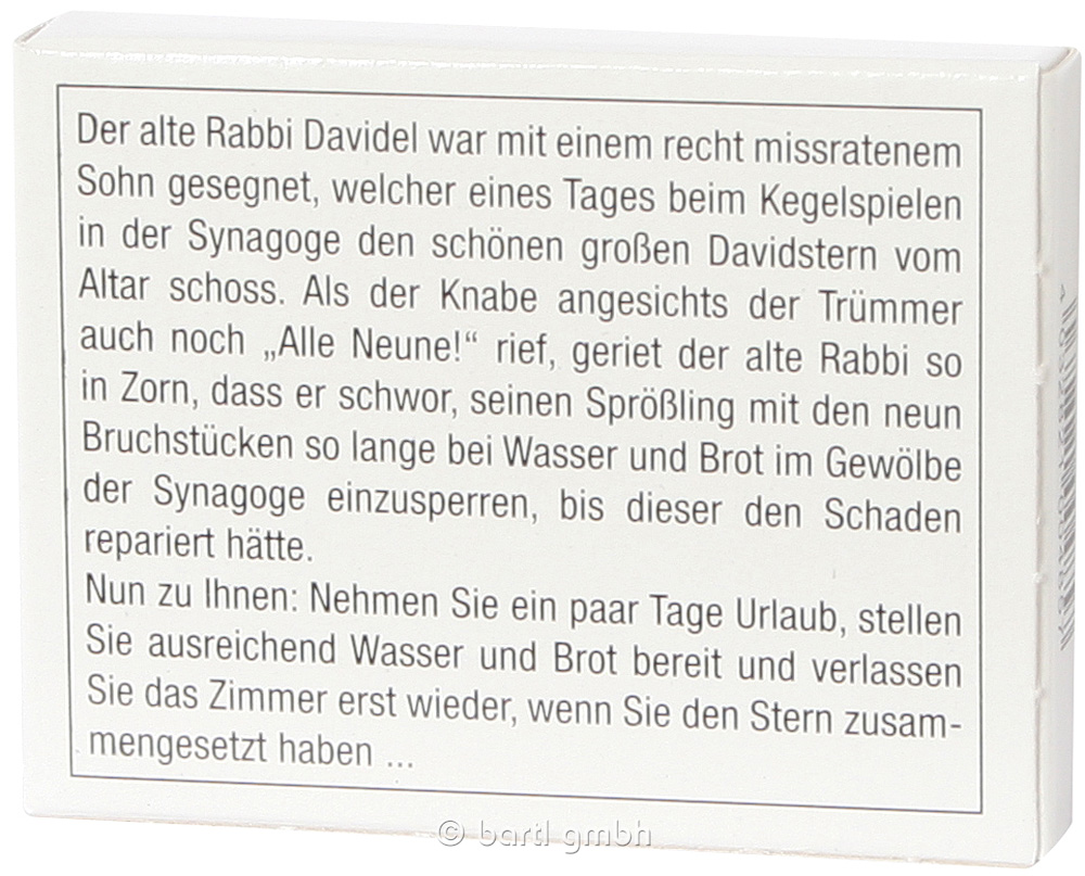Rabbi Davidels Sohn schoss beim Kegelspielen den David-Stern vom Altar. Zur Strafe musste er die neun Teile wieder zum Stern zusammenbauen!