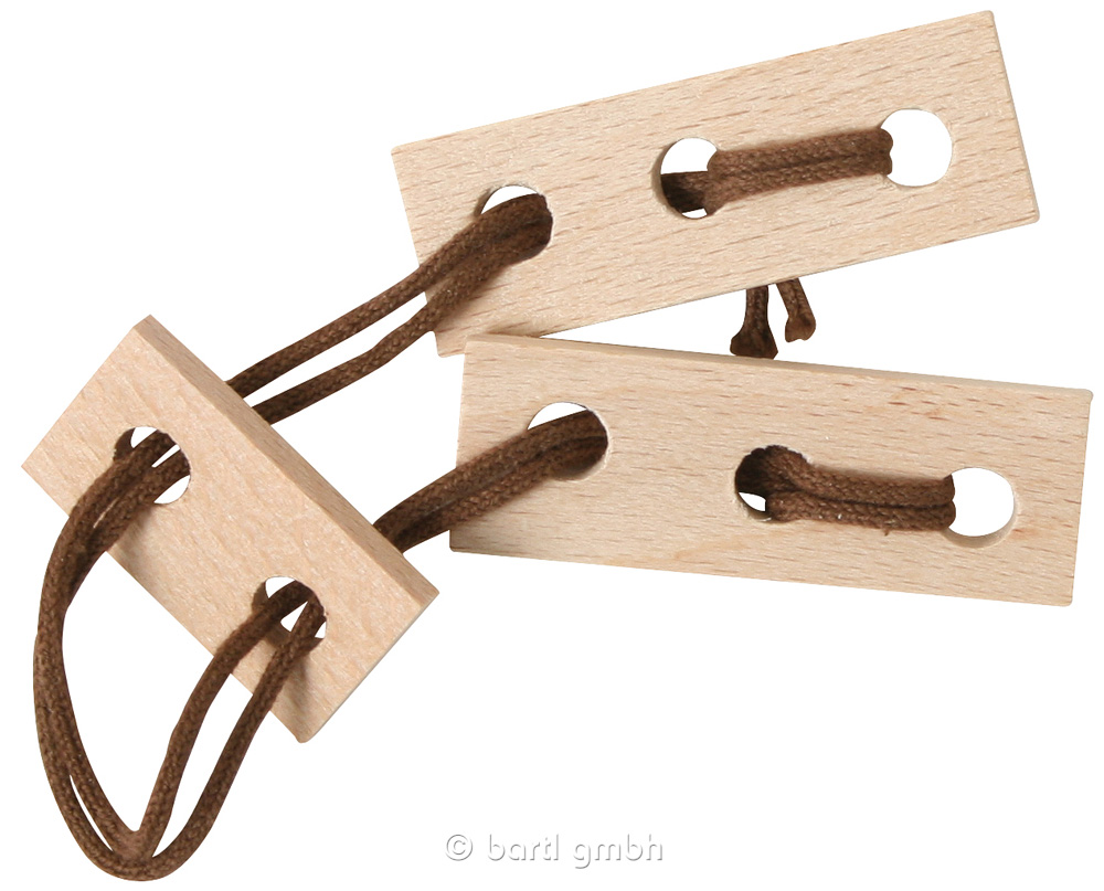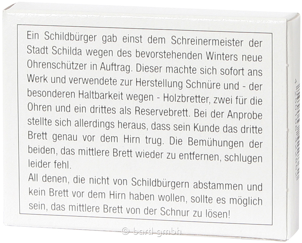 Ein Schildbürger ließ sich für den Winter hölzerne Ohrenschützer machen. Er hatte aber zwei Bretter an den Ohren und ein drittes vor dem Kopf. Lösen Sie das mittlere Brett von der Schnur!