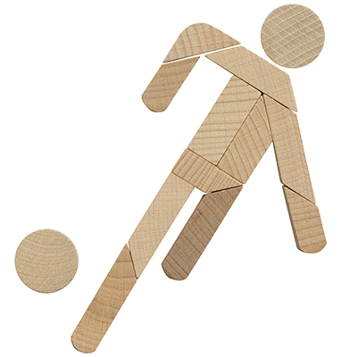 So puzzelt ein Fußballer aus 13 Teilen einen Stürmer: Erst spielt er alle ins Abseits. Dann entwickelt er eine Strategie: Hmm, das platziere ich linksaußen ... Nach 90 Minuten ballert er das Puzzle ins Eck, schimpft über den Schiri und genehmigt sich ein Bierchen im Vereinsheim, denn ein guter Fußballer feiert auch eine Niederlage. Kniffliges Holzpuzzle für Klein und Groß!