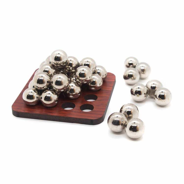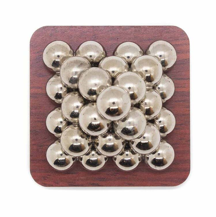 Diese Kugelpyramide in viereckiger Grundform sieht einfacher aus als sie ist. Die 10 Elemente müssen so auf dem Brett platziert werden, dass sie eine Pyramide mit vier Ebenen ergeben.
