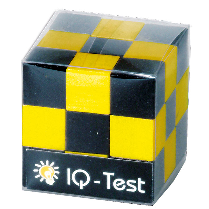Der Schlangenwürfel gelb/schwarz besteht aus 27 mit einem Gummiband verbundene Holzteile in den Farben gelb und schwarz, die man zu verschiedenen Formen anordnen kann.