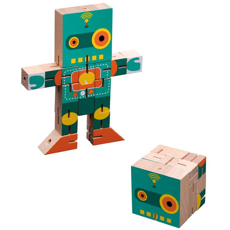 Ziel dieses Würfel-Puzzles ist es, die mit Gummiseilen verbundenen Teile so anzuordnen, dass am Ende die abgebildete Figur entsteht. Anschließend muss die Figur wieder zurück in die Würfelform gebaut werden.