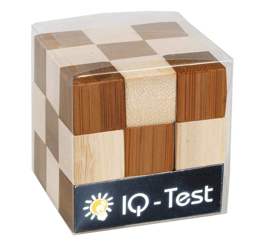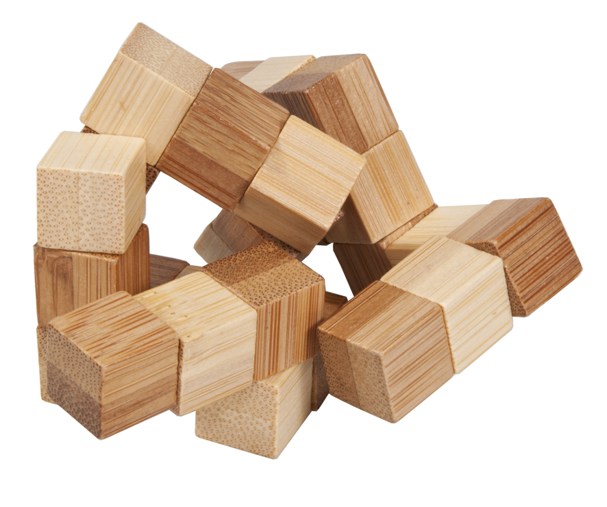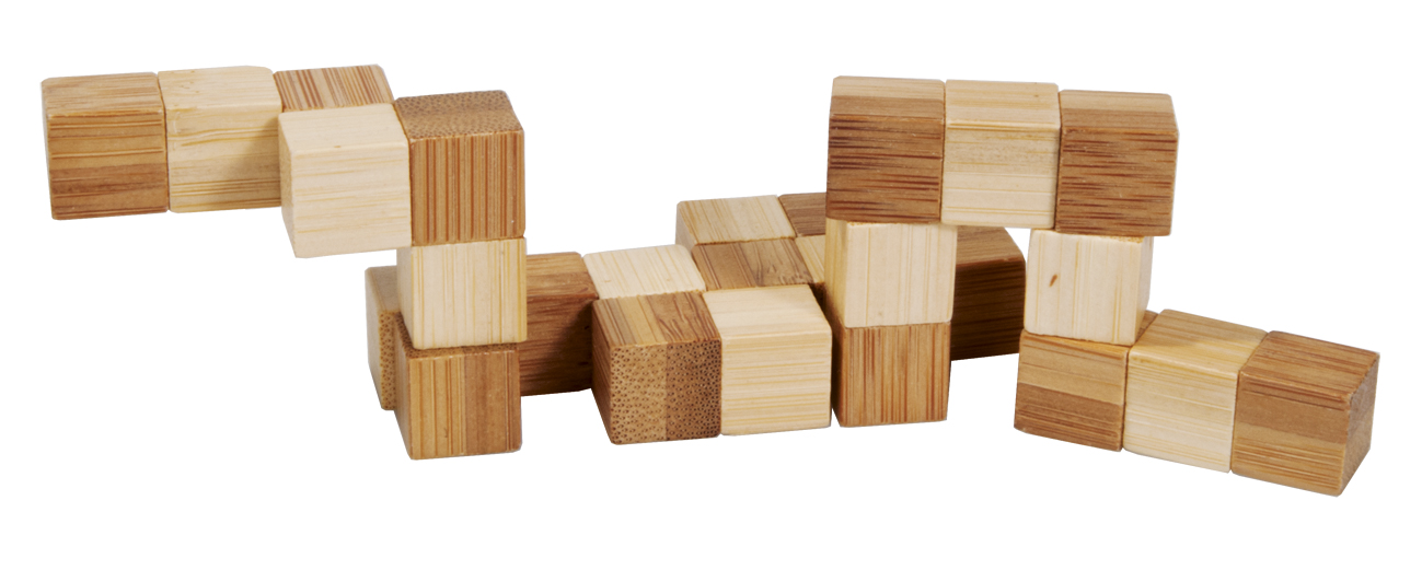 Der Schlangenwürfel in hellem und dunklem Bambus besteht aus 27 mit einem Gummiband verbundene Bambusteile, die man zu verschiedenen Formen anordnen kann.