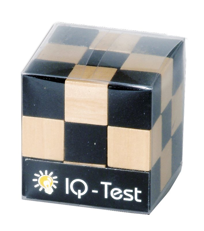Der Schlangenwürfel natur/schwarz besteht aus 27 mit einem Gummiband verbundene Holzteile in den Farben natur und schwarz, die man zu verschiedenen Formen anordnen kann.