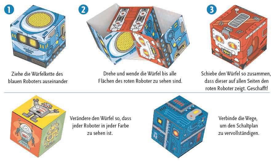Block Chain Roboter: Jedes Set dieses einzigartigen Brainteasers enthält 3 unterschiedliche Varianten, in drei verschiedenen Herausforderungsstufen. Die Block Chain Würfel-Kette kann auseinander gezogen und neu arrangiert, wieder zurück geschoben werden. Dabei ändern sich die sichtbaren Flächen der einzelnen Würfel - findest du die richtige Lösung? Die drei verschiedenen Würfel-Ketten passen immer Thematisch zueinander und haben eine lustige, einzigartige Illustration.