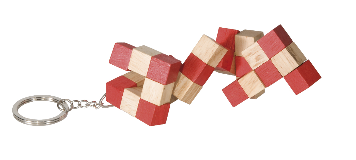 Der magische Schlangenwürfel natur/schwarz als Schlüsselanhänger. Der Schlangenwürfel ist aus Holz, die Teile sind mit einem Gummiband verbunden.
