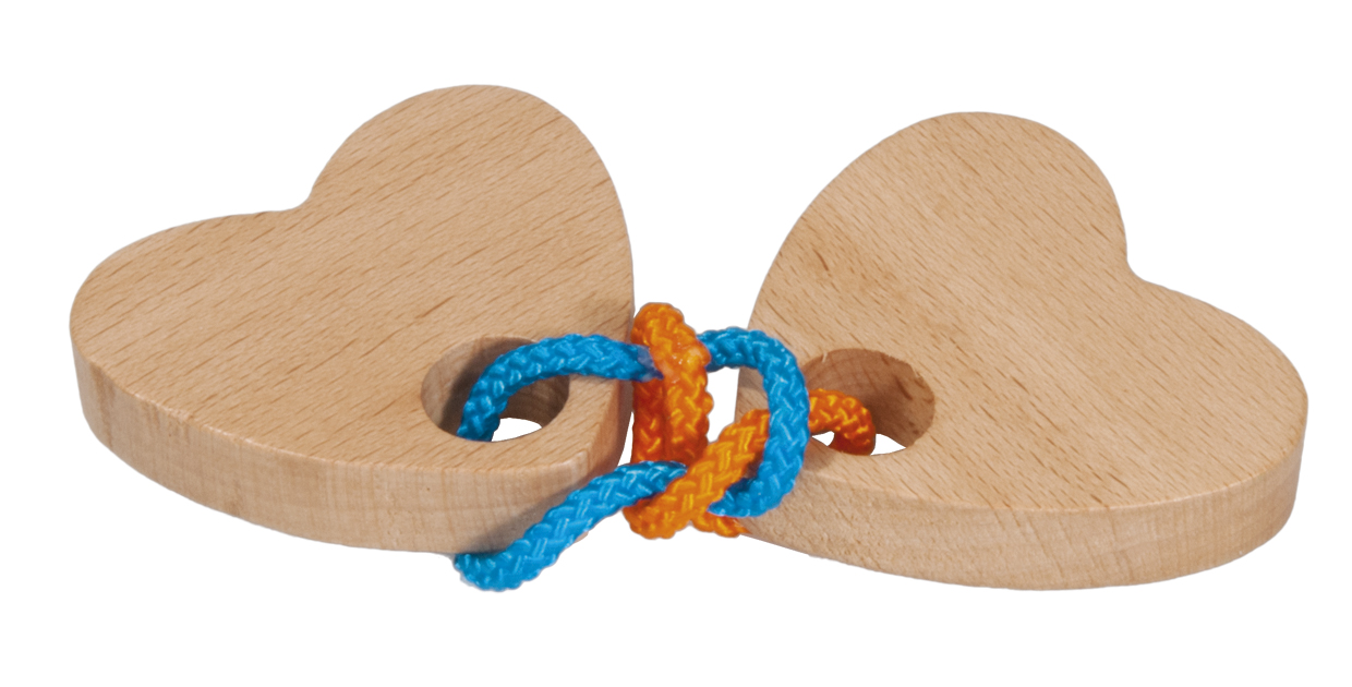 Seilpuzzle Zwei Herzen der Reihe "Genius" bestehend aus Seilen uind Holzteilen.