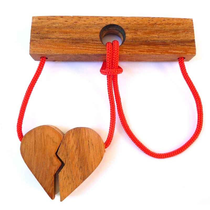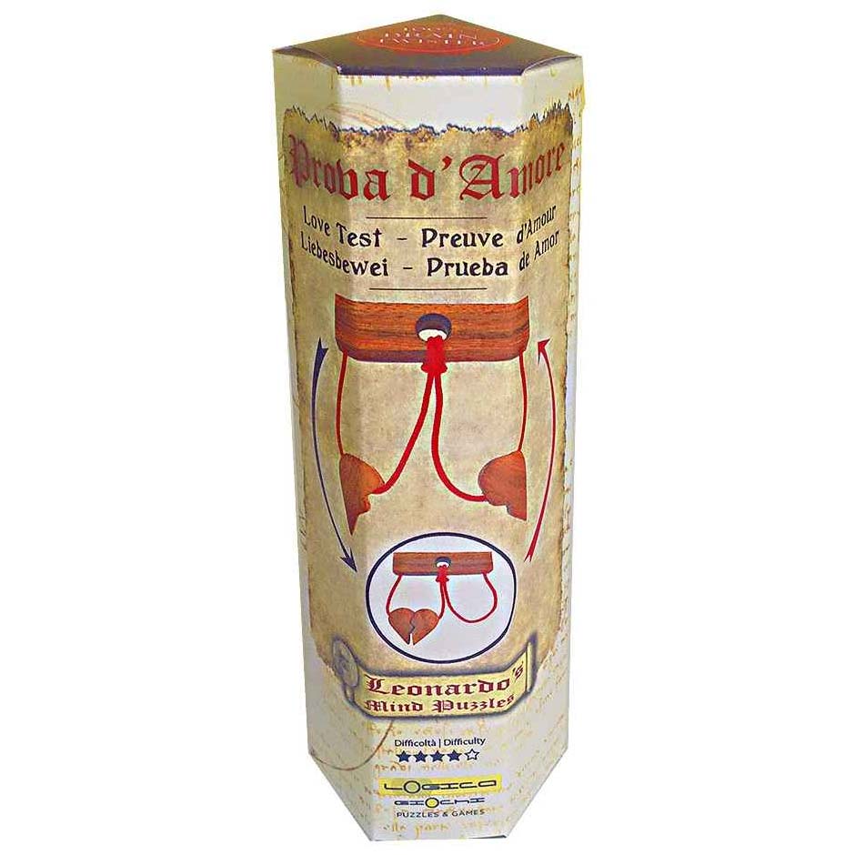 Love Test ist ein Seilpuzzle aus der Leonardo da Vinci Serie. Die 2 kleinen Herzstücke (die Verliebten) befinden sich (wohnen) in verschiedenen Schlingen (Häuser). Vielleicht sieht es nicht so aus aber sie sind sehr verliebt und möchten gern zusammen in einem Haus wohnen. Helfen Sie ihnen! Aufgabe: Einem Verliebten dabei helfen, von einer Schlinge zur anderen zu ziehen, wie im Bild dargestellt. Geschafft? Dann trennen Sie sie wieder (schicken Sie einen der Verliebten zum anderen Haus, um das zweite Kissen für das Ehebett zu holen).