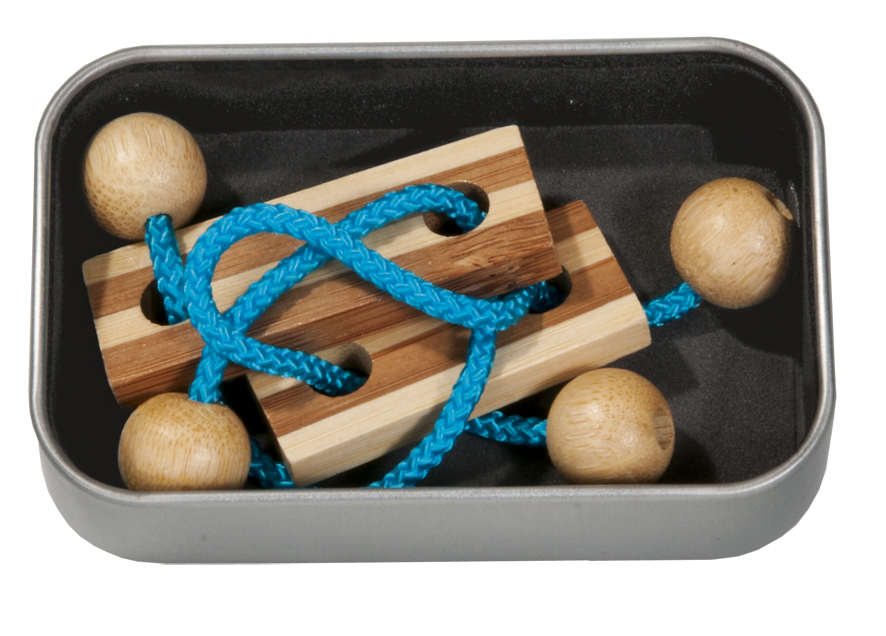 Das blaue Seilpuzzle in der Dose ist besonders praktisch für unterwegs. Die stabile Dose ist 6 x 2,2 x 9,4 cm groß und passt in jede Hosentasche. Die Holzteile bestehen aus schönem Bambusholz.