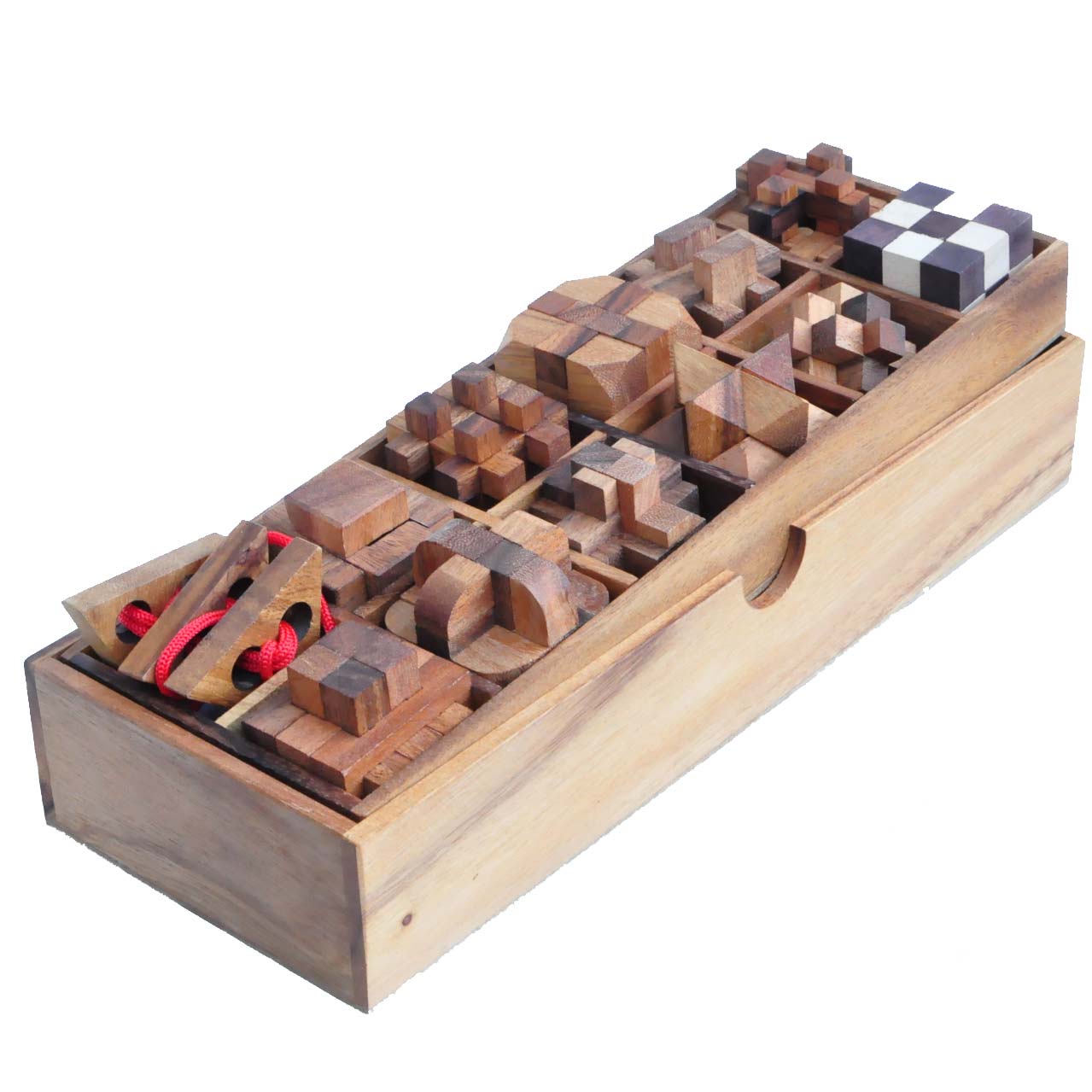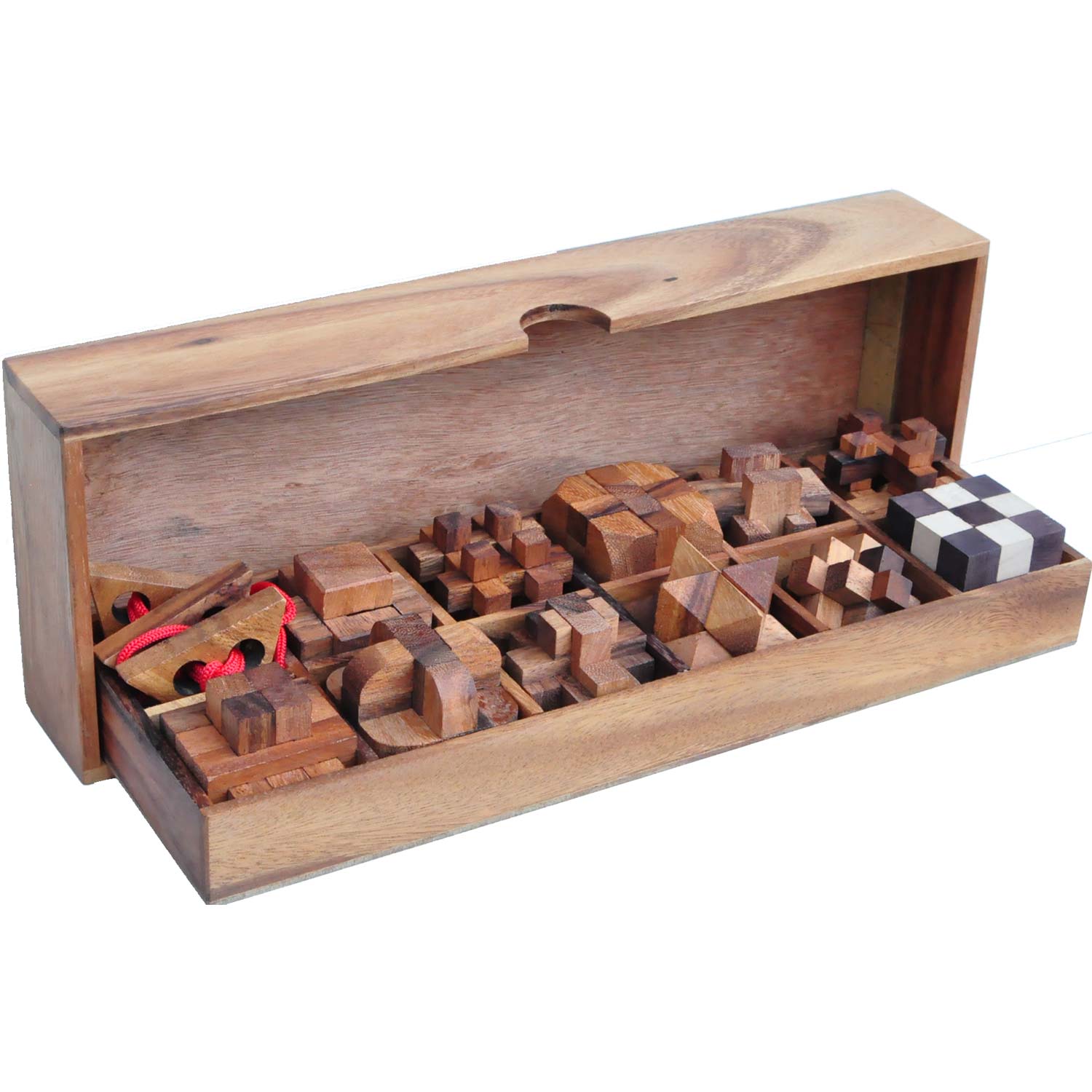 Dieses 12 in 1 Set ist ein wunderbares Geschenk für jeden Geduldspiele-Fan! Es besteht aus einer schönen Holzschachtel mit 12 Denkspielen aus Holz auf unterschiedlichen Schwierigkeitsniveaus. Aufgabe der Puzzle: Zerlegen und wieder zusammenbauen.