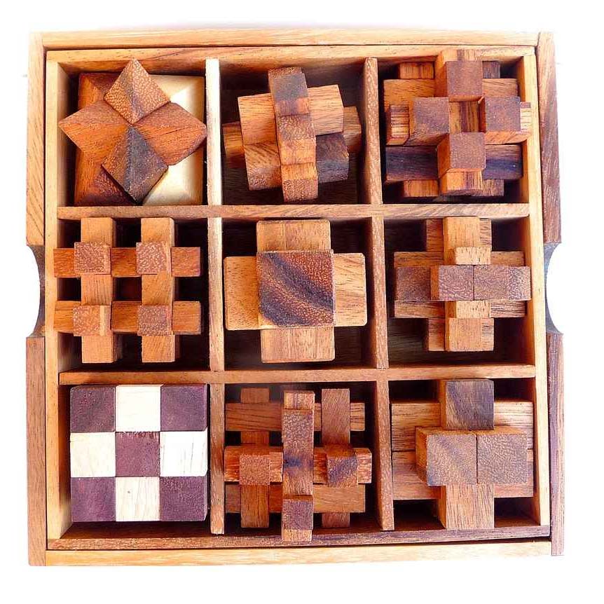 Dieses 9 in 1 Set ist ein wunderbares Geschenk für jeden Geduldspiele-Fan! Es besteht aus einer schönen Holzschachtel mit 9 Denkspielen aus Holz auf unterschiedlichen Schwierigkeitsniveaus. Aufgabe der Puzzle: Zerlegen und wieder zusammenbauen.