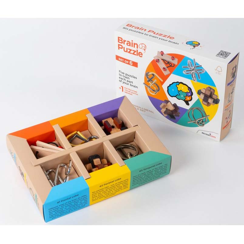 Das Brain Puzzle Set beinhaltet 6 verschiedene Puzzle. Darunter sind 3 Metallpuzzle, 2 Holzpuzzle und ein Seilpuzzle. Aufgabe ist es jeweils, die Puzzleteile voneinander zu trennen und anschließend wieder zusammen zu setzen.