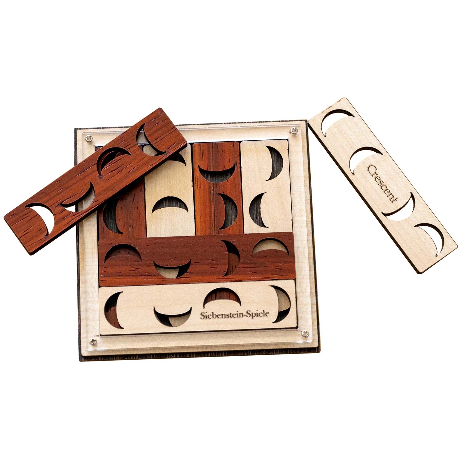 Crescent ist ein Legepuzzle von Siebenstein-Spiele. Aufgabe ist es, die 8 Puzzleteile so in die Form zu legen, dass die Halbmonde auf der unteren Ebene die gleiche Richtung haben wie die in der oberen Ebene.