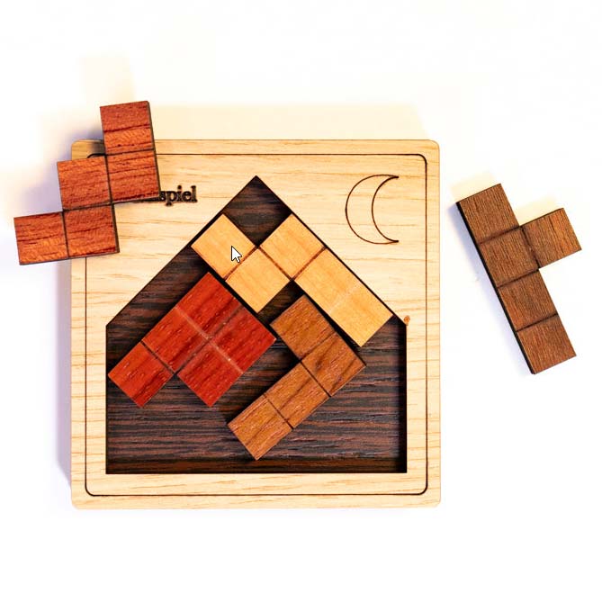 Heimspiel ist ein Legepuzzle von Siebenstein-Spiele mit zwei verschiedenen Aufgaben. Es gibt zwei verschiedene Formen auf der Vorder- und Rückseite. Versuchen Sie, die 5 Puzzleteile in beide Formen zu legen.