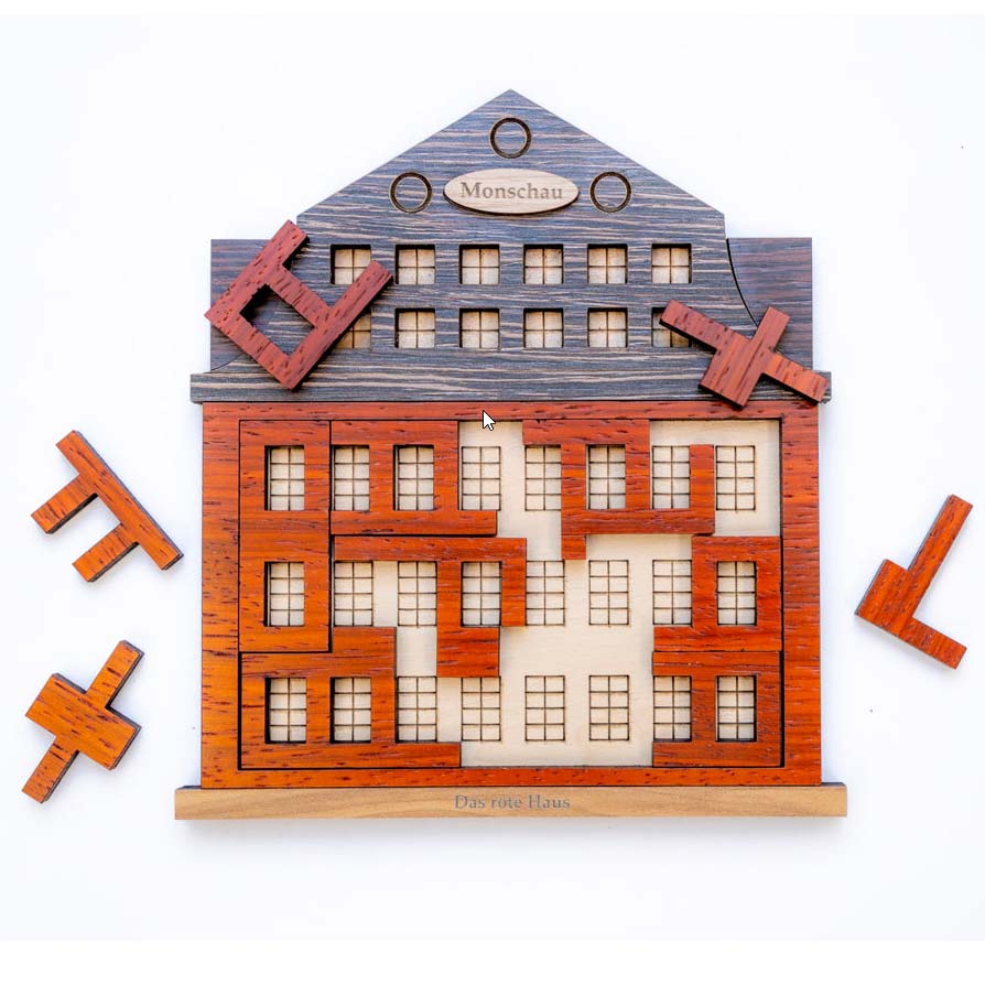 Das rote Haus von Siebenstein-Spiele ist ein klassisches Legepuzzle. Die Puzzleteile beinhalten die Fenster des Hauses. Aufgabe ist es, das Haus ind er Form zu kompletieren.
