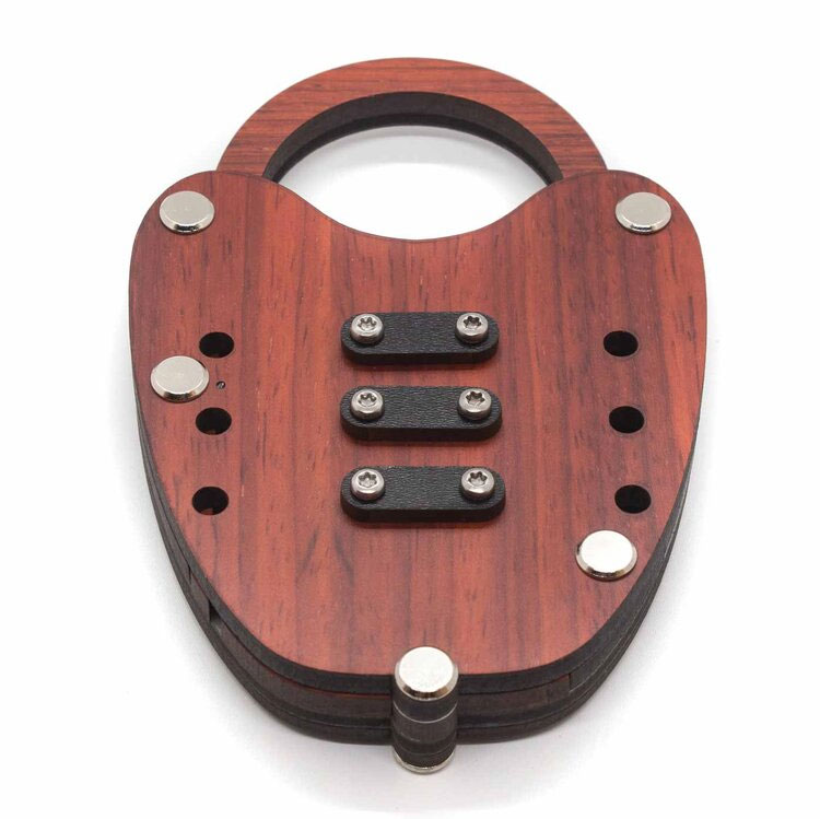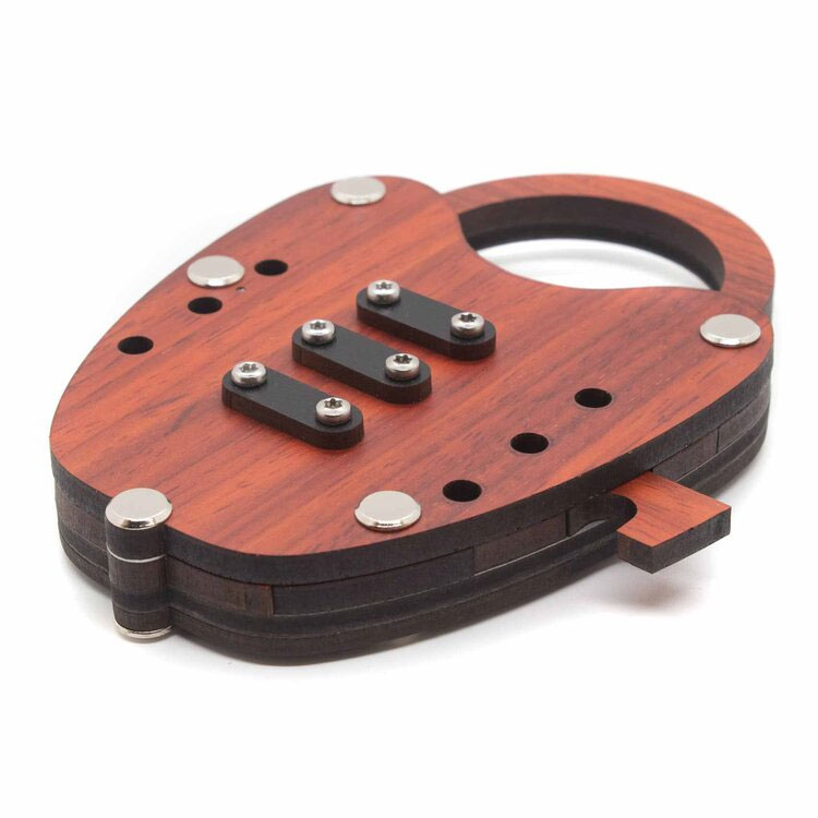 Alpha Lock ist ein Trickschloss aus Holz, das keinen Schlüssel benötigt. Aufgabe ist es, die Schieber horizontal zu verschieben und die Kugeln korrekt zu platzieren. Durch Drucken wird das Schloss geöffnet.